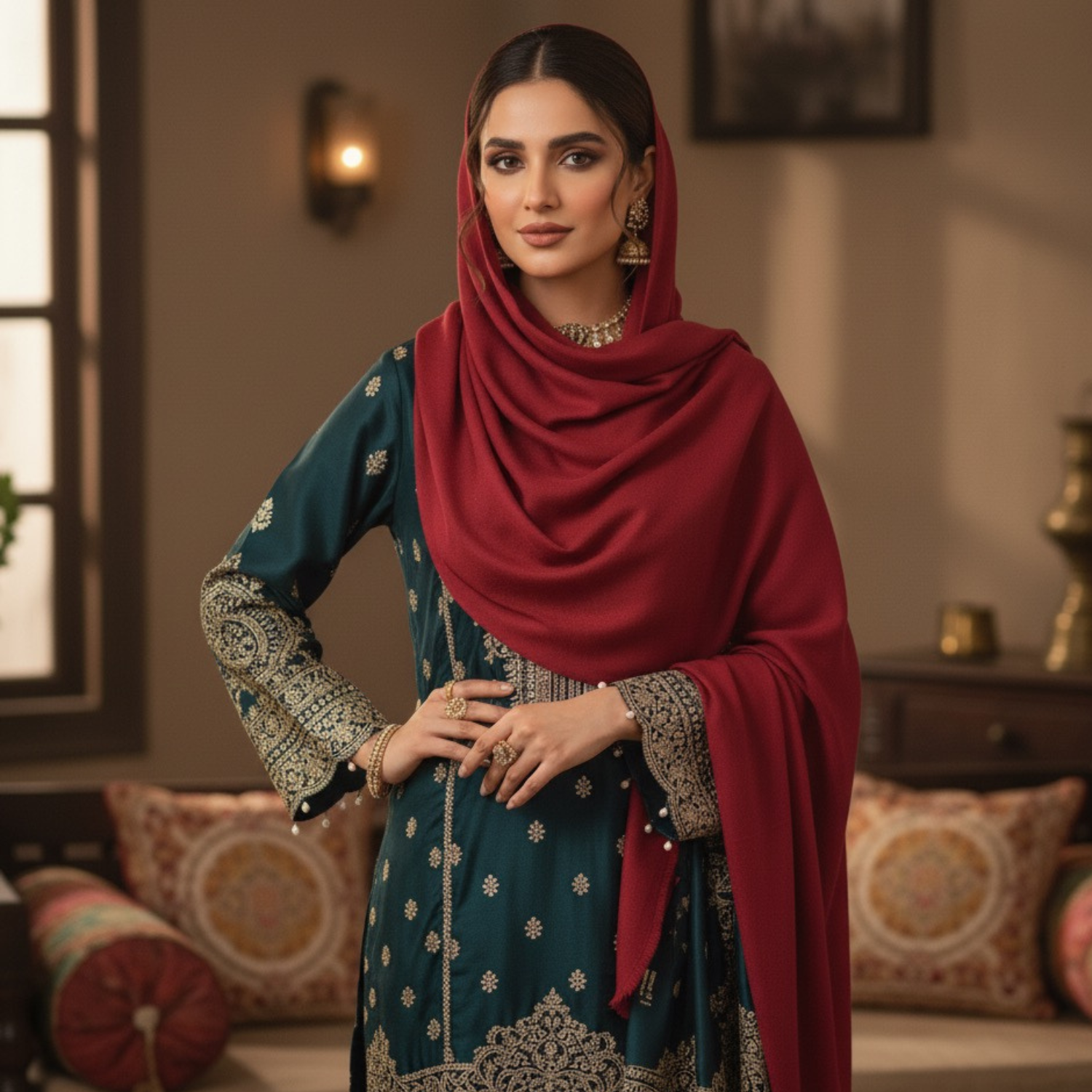 Grace that suits everyone. This unisex pashmina shawl brings together softness, warmth, and delicate embroidery near the fringes for a look that’s both elegant and versatile. Lightweight yet cozy, it’s perfect for chilly evenings, family events, or everyday wear. Whether wrapped around the shoulders or draped traditionally, it carries an air of effortless sophistication.